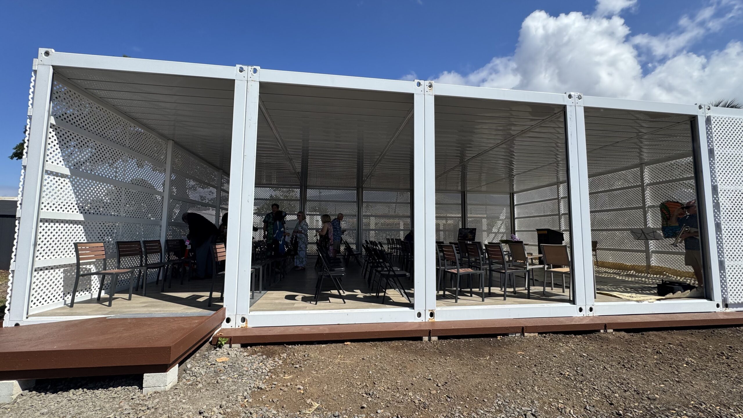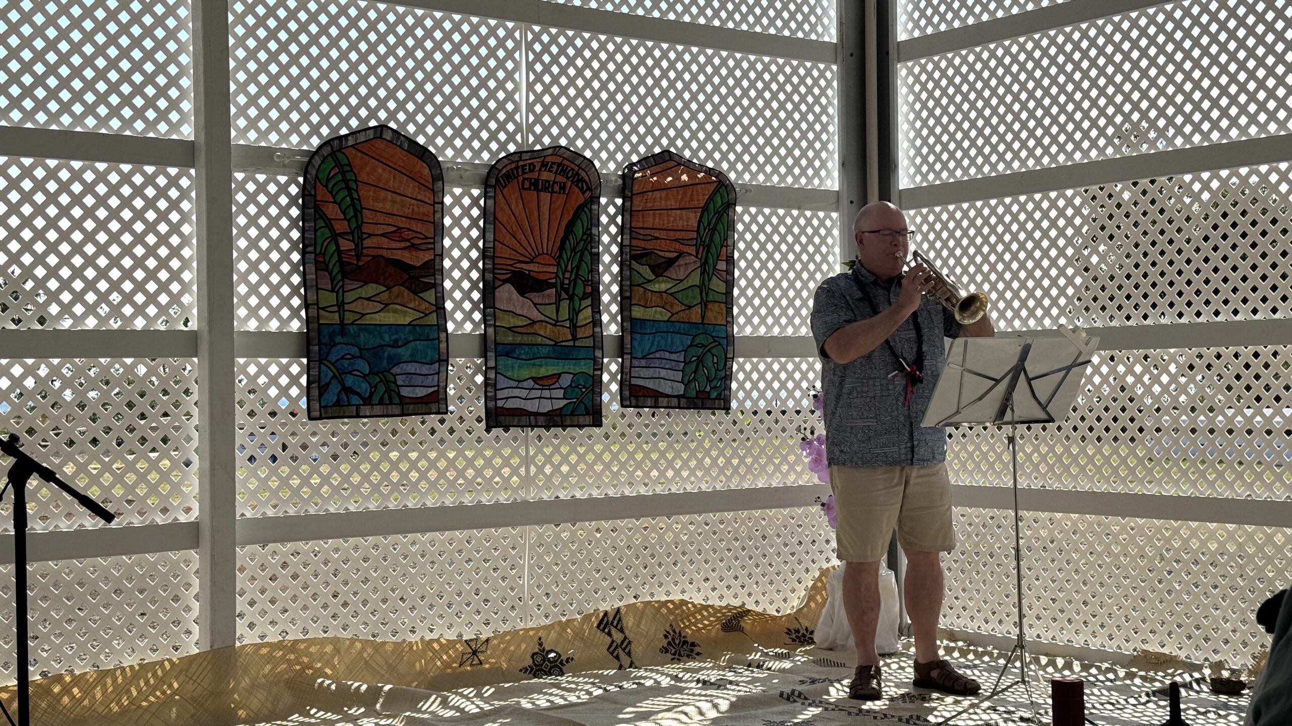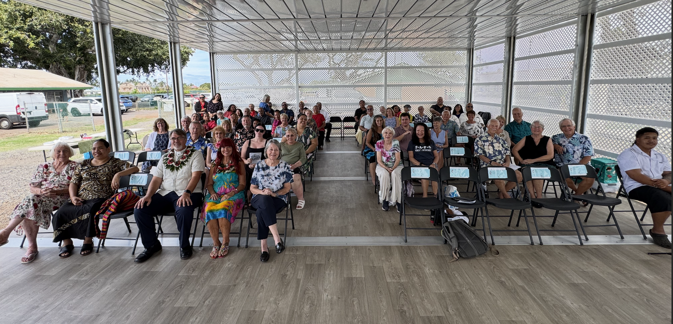 The garden sanctuary was full to overflowing with members of the congregation and Lahaina at large, including interfaith leaders. The church choir shared hymns in Tongan, blessing the new space with joyful song. Brad Hurte played trumpet, sharing Great is Thy Faithfulness, and accompanying the closing hymn. Three quilts hung on the wall behind the choir, a beautiful recreation of the stained glass in the building that was lost in the fire.